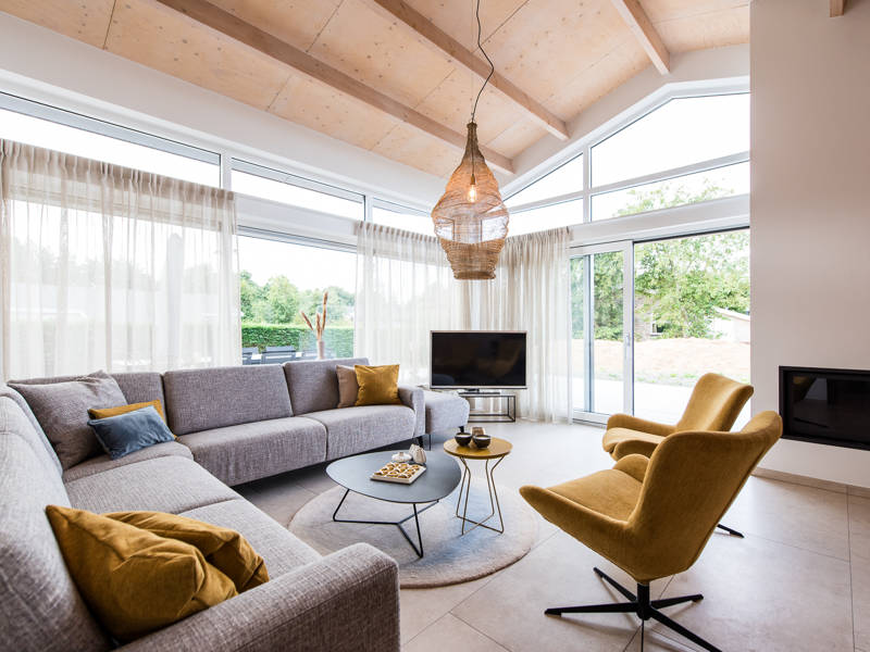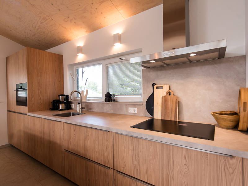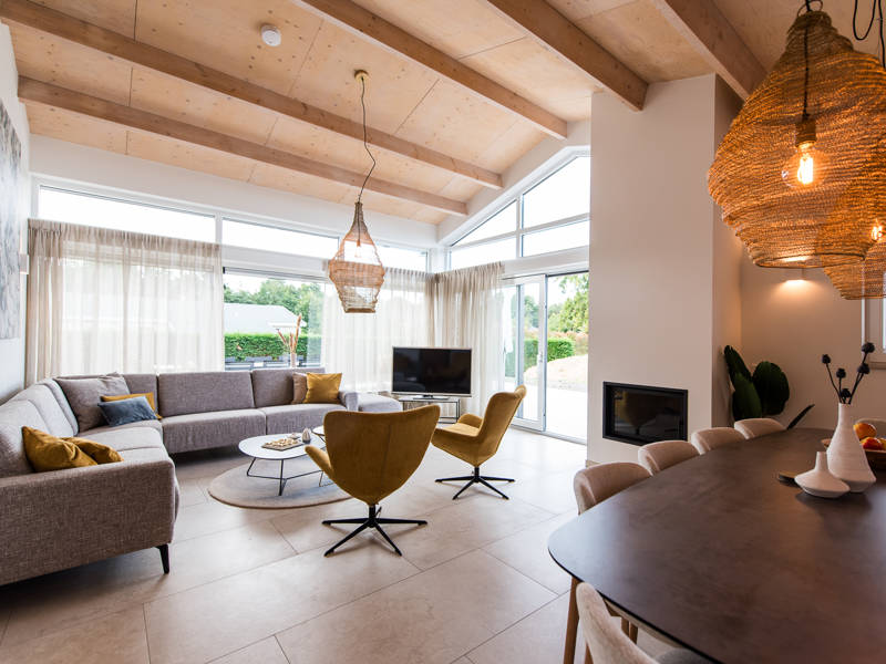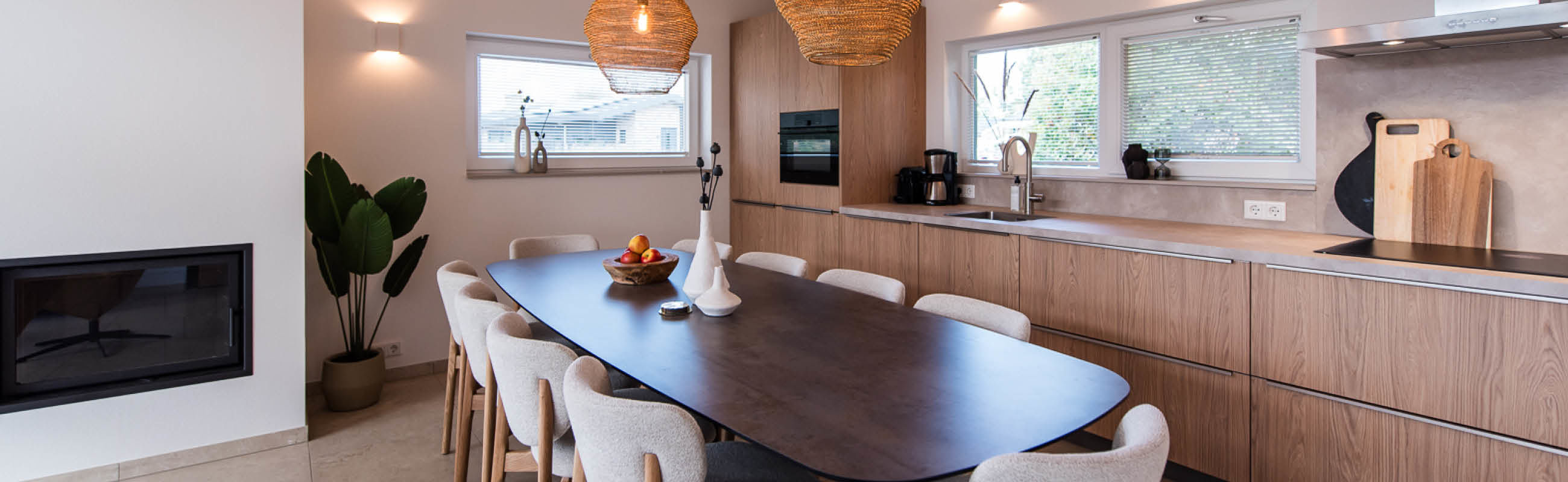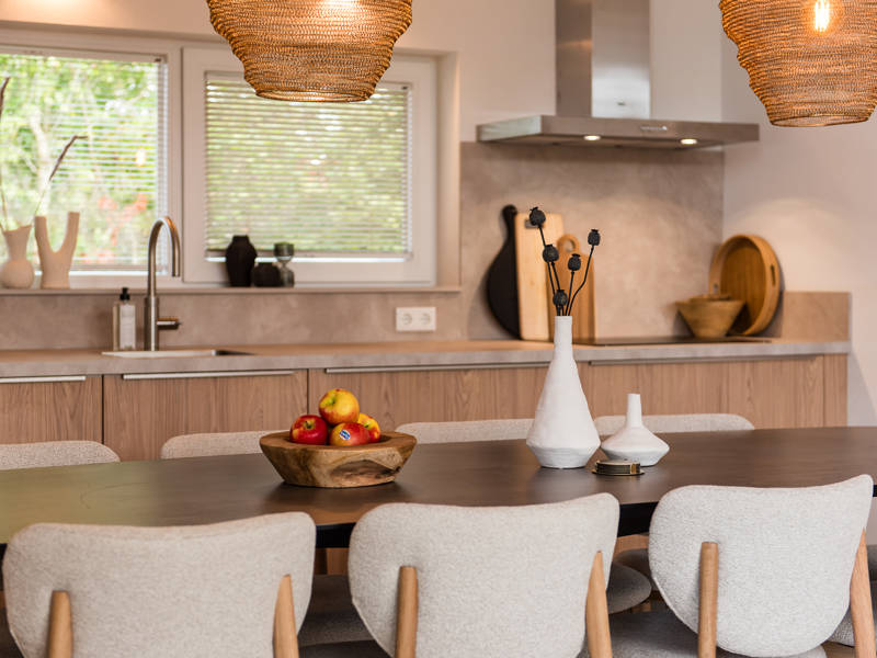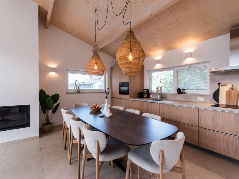 De open keuken is volledig ingericht met moderne apparatuur, zodat je met gemak een uitgebreid diner bereidt of gewoon een snelle maaltijd serveert aan de grote eettafel. De aangrenzende woonkamer biedt een gezellige zithoek met uitzicht op de tuin.
