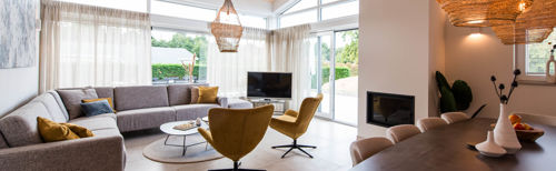 De woning is stijlvol ingericht in een frisse eiland- en strandstijl. Met vijf comfortabele slaapkamers, voorzien van luxe boxspringbedden, is er volop ruimte voor iedereen. De drie moderne badkamers zorgen ervoor dat niemand hoeft te wachten, en met twee aparte toiletten is ook aan het praktische comfort gedacht.