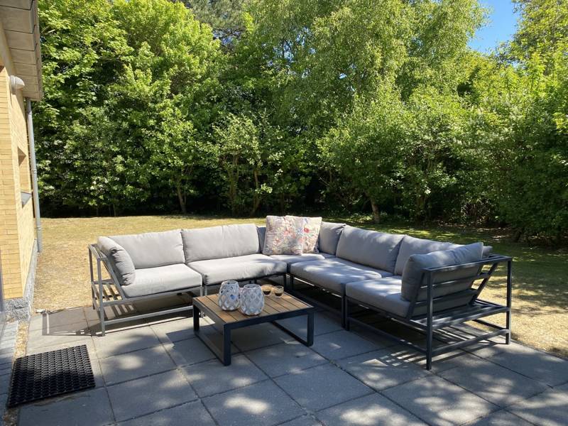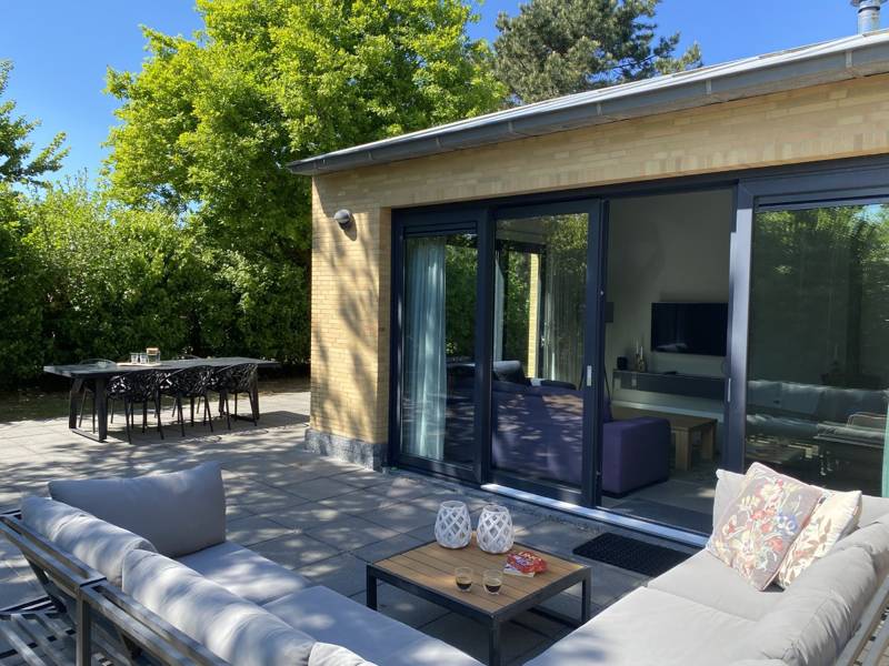 Via de schuifdeur heeft u direct toegang tot het terras op het zuiden, waar een loungebank en een tafel met stoelen staan. Dit is een heerlijke plek om samen te ontspannen, waardoor De Juffer een uitstekend vakantiehuis voor gezinnen met kinderen is.