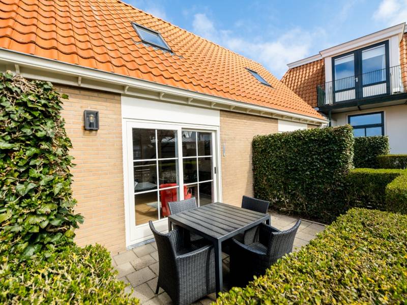 Het terras ligt beschut, op het zuiden en is volledig omheind. Het kijkt uit over het binnenhofje met barbecue.