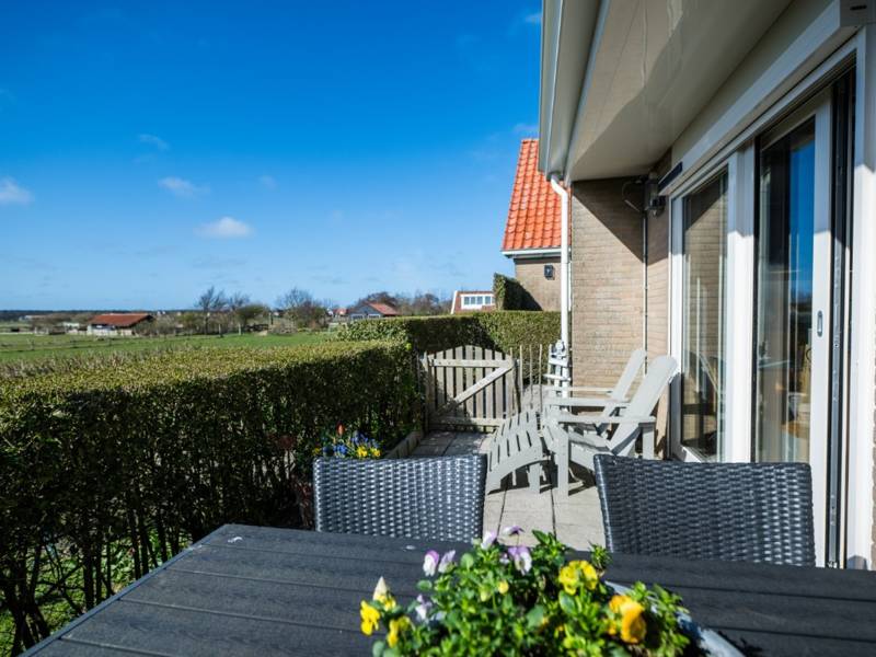 Het terras ligt hier niet aan het hofje maar aan de kant van de weilanden met prachtig uitzicht. De voordeur van het huisje ligt wel aan het binnenhofje (met gratis te gebruiken barbecue). Het terras ligt beschut, op het westen en is volledig omheind.