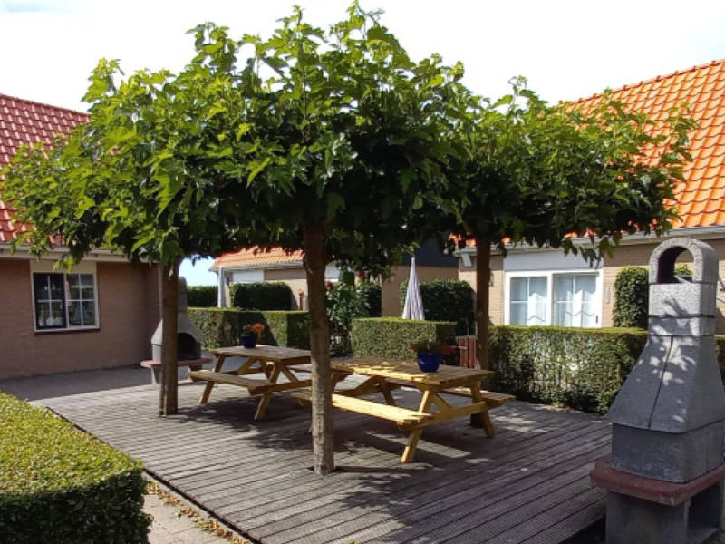 Het terras ligt beschut en is volledig omheind. Het kijkt uit over het binnenhofje met barbecue.