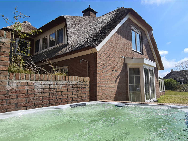 Rondom het huis ontbreekt u aan niks. Op het houten terras is een grote eettafel met parasol, ligstoelen en loungeset. Tevens is hier een Jacuzzi met buitendouche en op het gras staat een schommel.