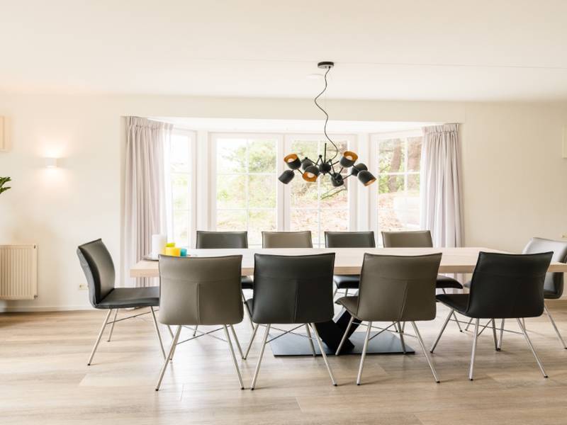 Royale living met zithoek, flatscreentelevisie, houtkachel en deuren naar het terras. De open keuken is volledig ingericht met onder andere een Nespresso apparaat, inductiekookplaat en combi-oven. In de eethoek staat een 10 tot 12-persoons eettafel.