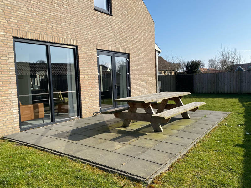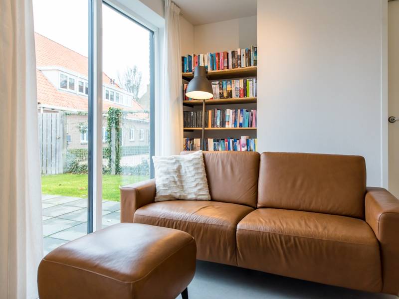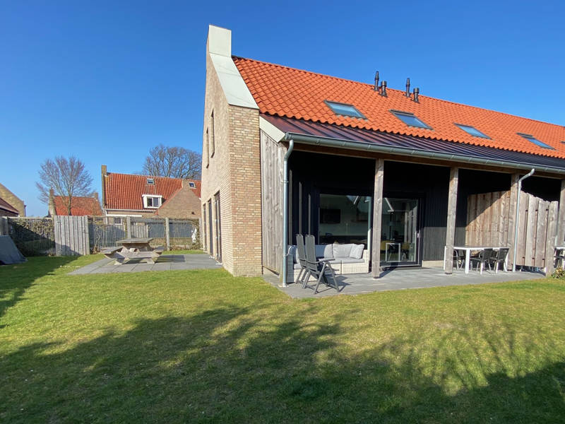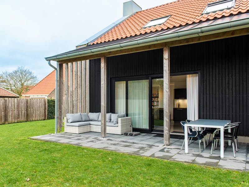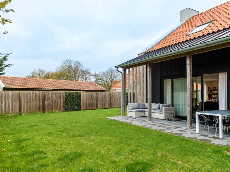 Via de woonkamer heb je toegang tot het ruime terras met terrasmeubilair en de grote tuin van dit luxe vakantiehuis op Ameland.