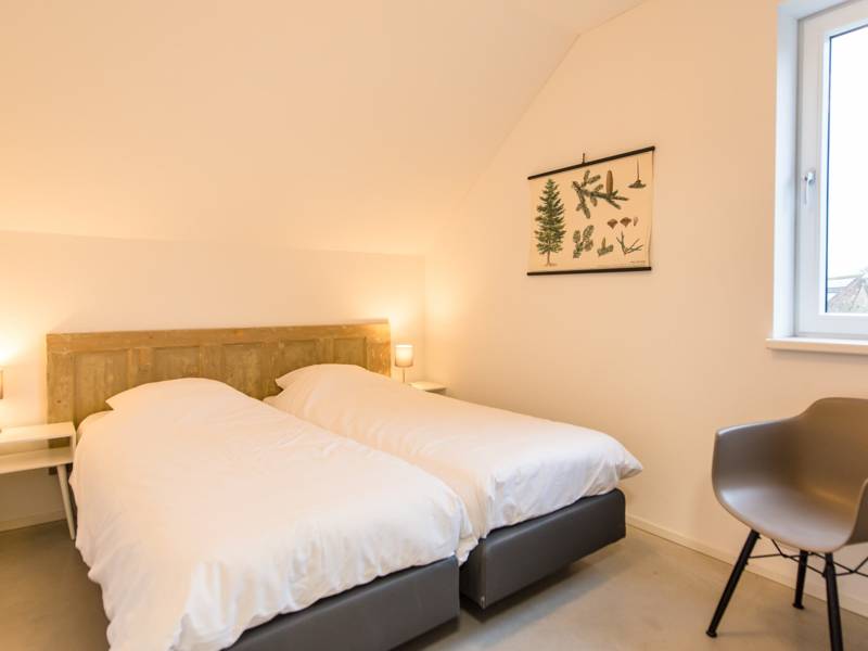 - 1 slaapkamer met boxspringbedden, een ensuite badkamer met douche, toilet en wastafel.