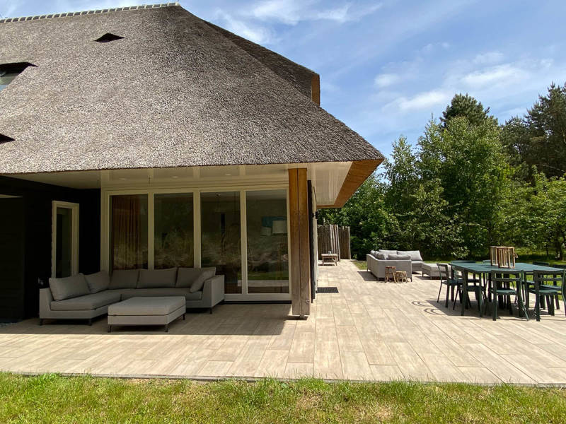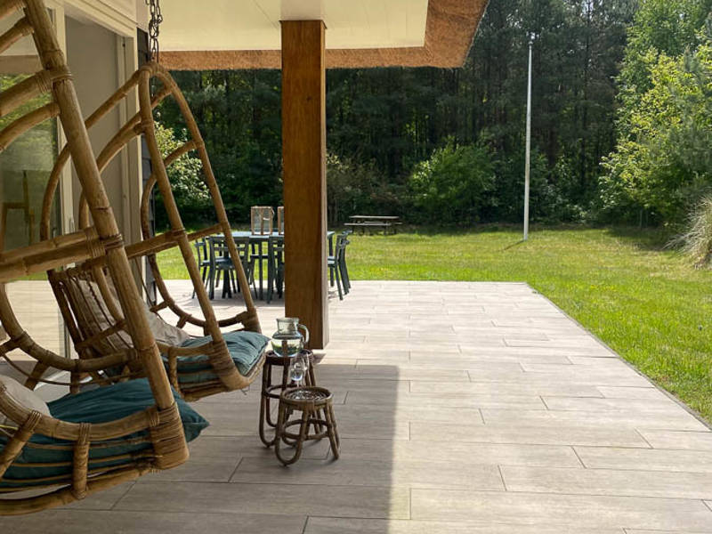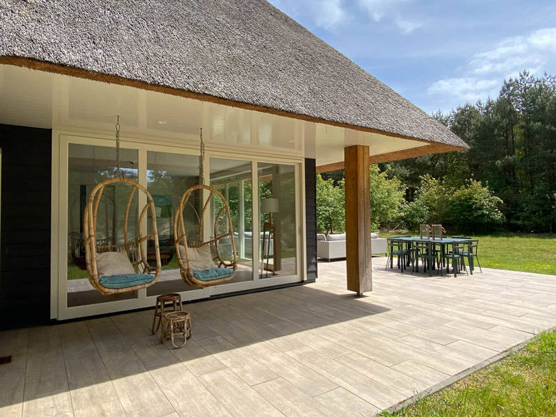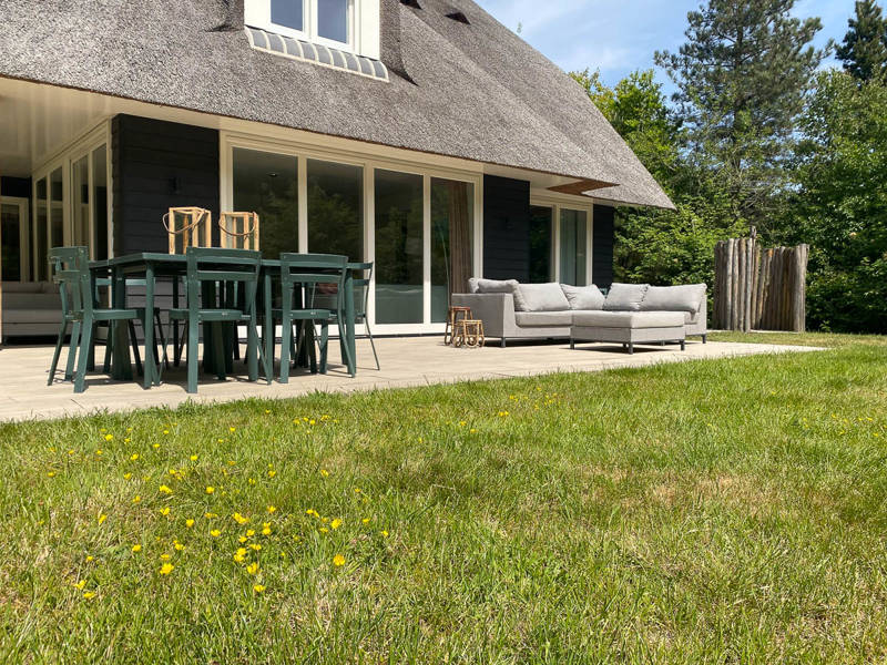 Via de schuifdeuren in de woonkamer en de slaapkamer op de begane grond bereikt u de veranda en het terras, die direct aansluiten op de grote tuin.