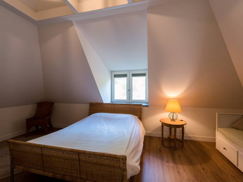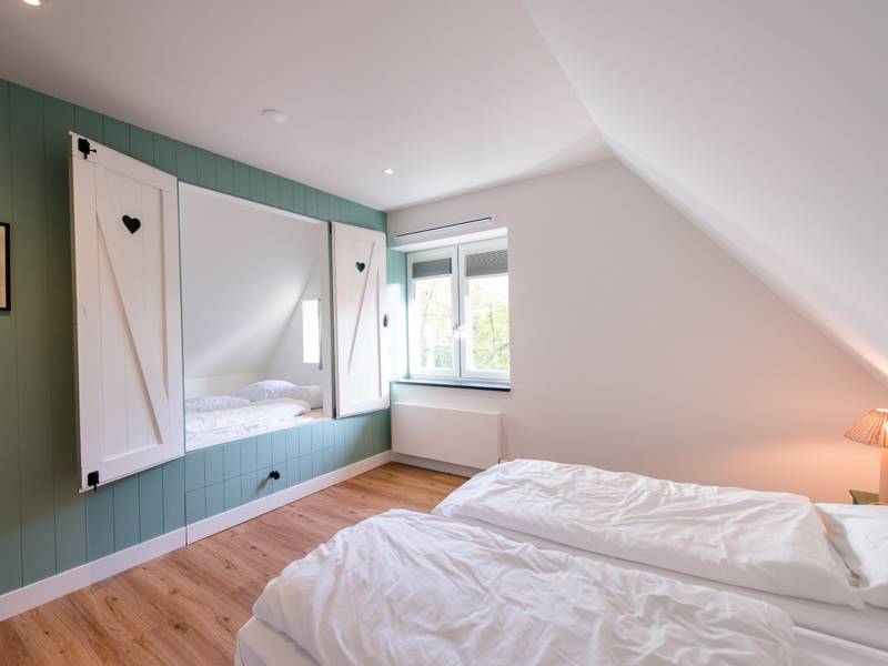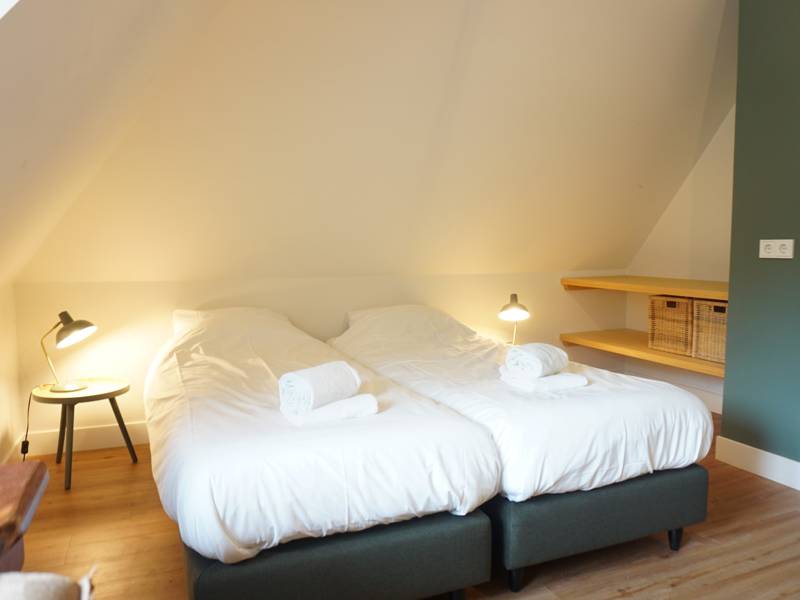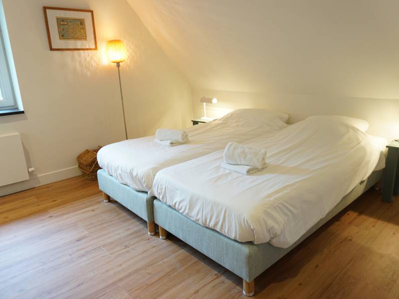 Een slaapkamer met twee boxspringbedden (90x200 cm) en een ruime bedstee (160x200 cm), geschikt voor twee extra personen of kinderen.