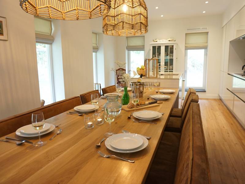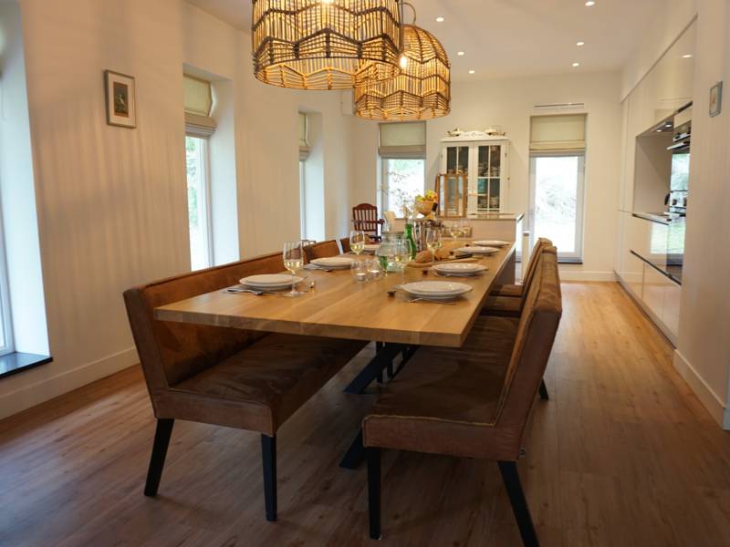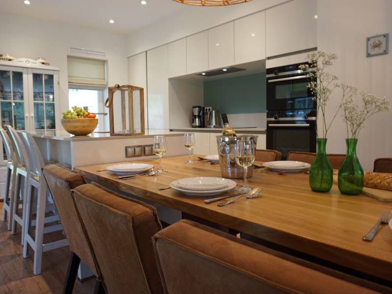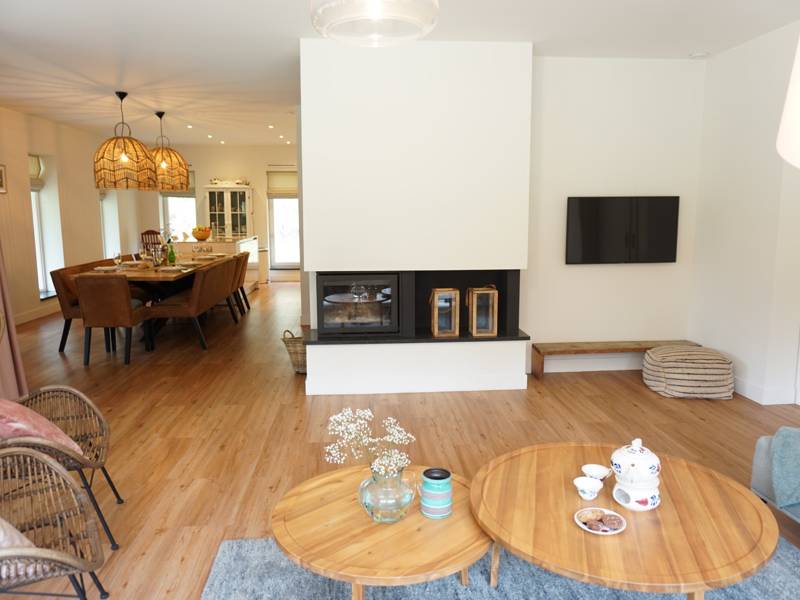 De luxe open keuken met kookeiland is volledig uitgerust en van alle gemakken voorzien. In het verlengde van het kookeiland staat een ruime eettafel voor 10 personen, die naadloos overloopt in de sfeervolle woonkamer. Hier kunt u ontspannen in de comfortabele zithoek of in de heerlijke hangstoelen, terwijl u geniet van de flatscreen-tv, vloerverwarming en de houthaard.