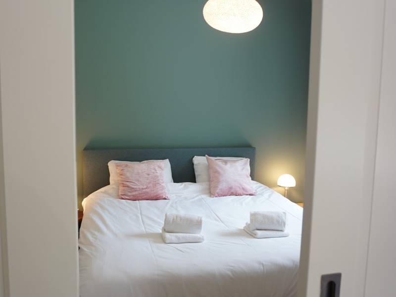 Een slaapkamer met schuifdeuren vanuit de woonkamer, voorzien van twee boxspringbedden (90x200 cm) en een badkamer en-suite.