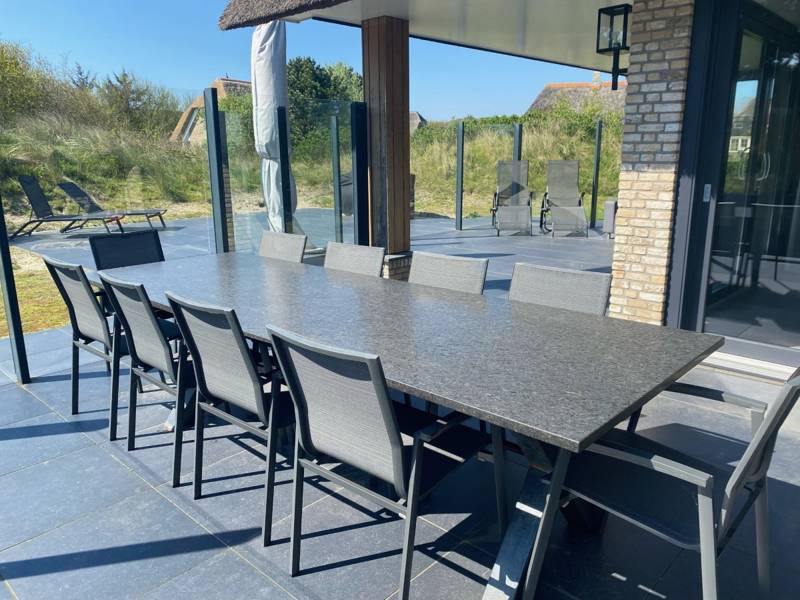 Buiten geniet u van een ruim (deels overdekt) terras met een grote eettafel en een luxe loungeset.