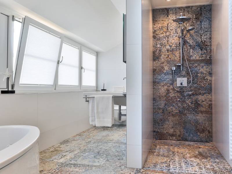 Een ruimere badkamer met bad, grote inloopdouche, dubbele wastafel, toilet en een 3-persoons infraroodsauna – dit maakt Pura Vida Ameland een vakantiehuis met sauna.