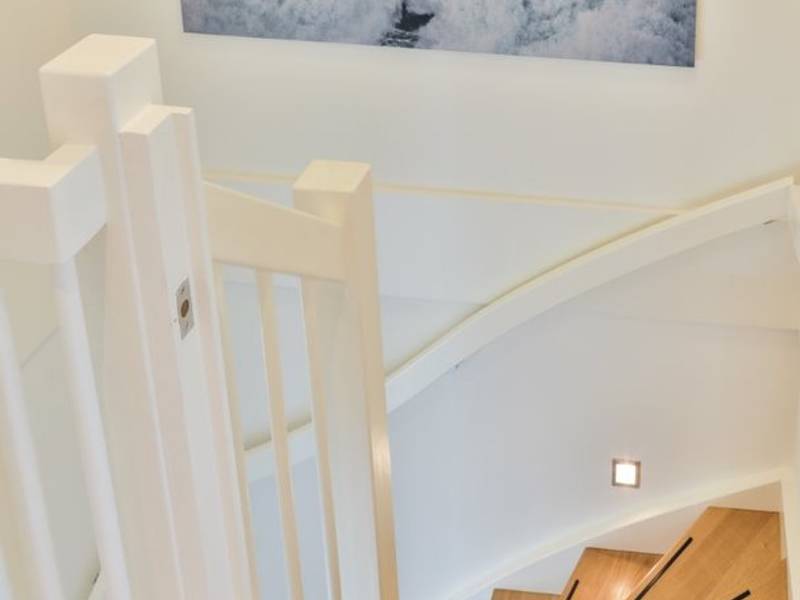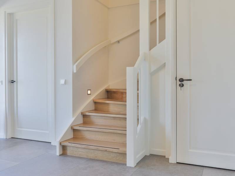 Binnen kan de trap boven afgesloten worden met een traphekje