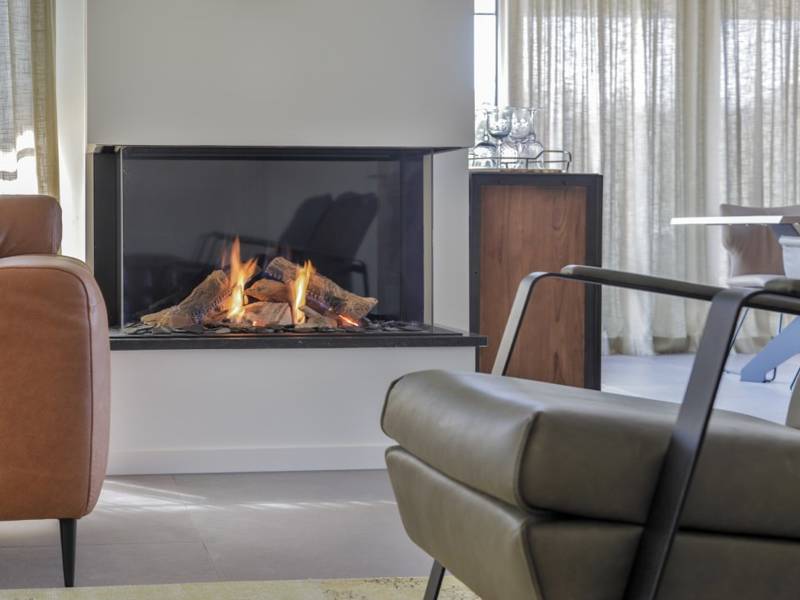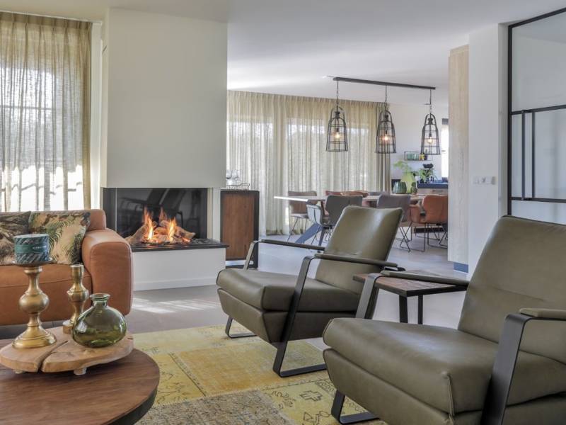 De luxe living, voorzien van vloerverwarming, beschikt over een comfortabele zithoek, een Smart TV en een sfeervolle gashaard.