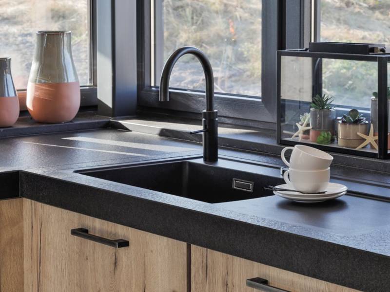 Aan één zijde van de keuken bevinden zich twee schuifdeuren, waardoor de keuken direct in verbinding staat met het terras als beide deuren openstaan. Een derde schuifdeur komt uit bij de eettafel, wat de verbinding tussen binnen en buiten optimaal maakt.