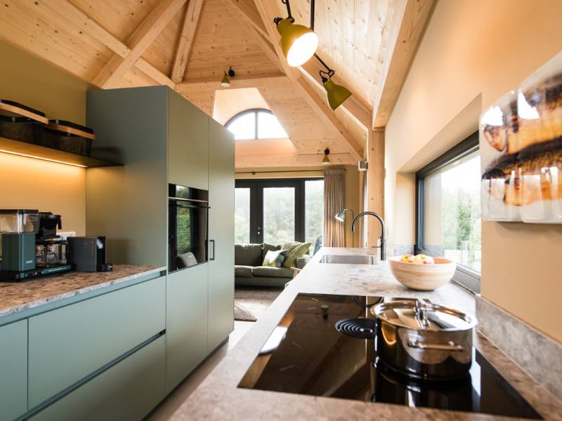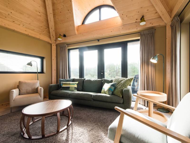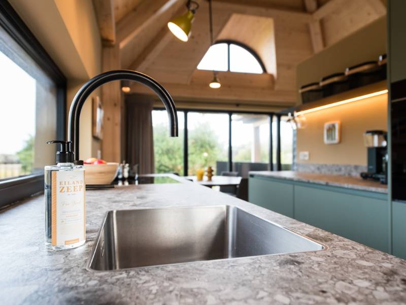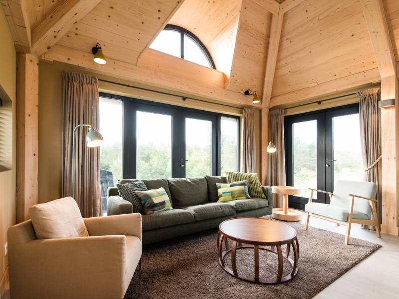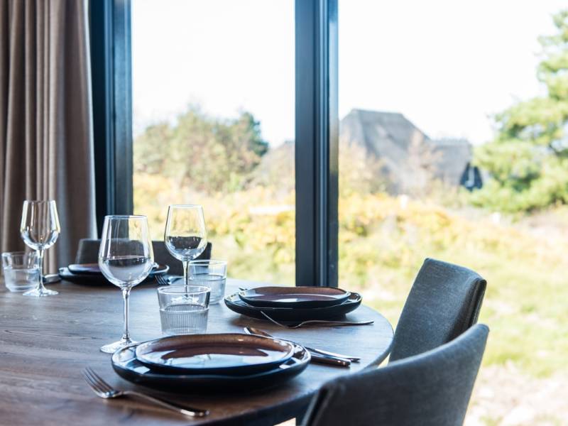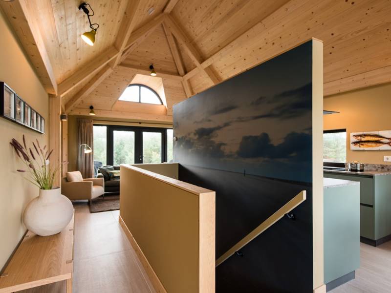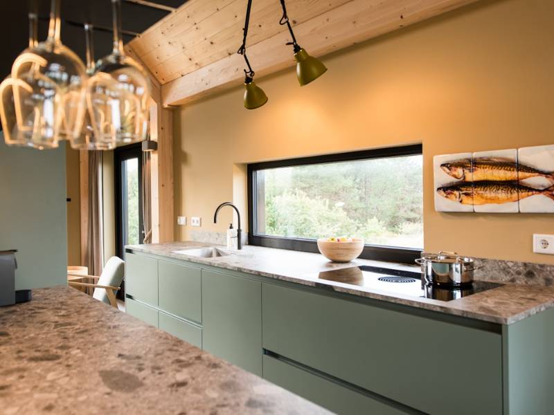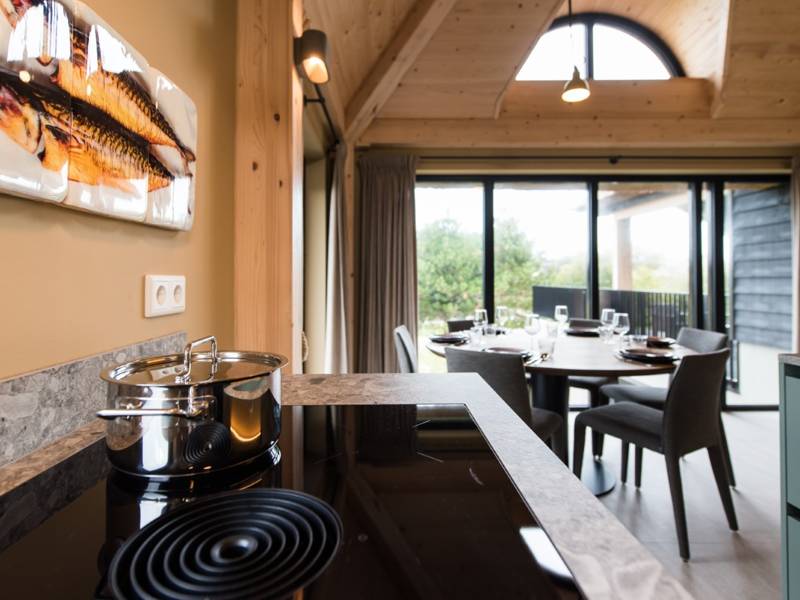 De Uitkijk is onder architectuur gebouwd en ingericht en beschikt over een lichte en stijlvolle woonkamer met comfortabele zithoek, flatscreen televisie en grote ramen die uitzicht bieden op de omliggende natuur. De moderne open keuken is volledig uitgerust met o.a. een vaatwasser, oven, koelkast met vriesvak en een ronde eettafel waar u samen kunt genieten van een uitgebreid ontbijt of een gezellige spelletjesavond.