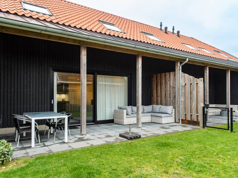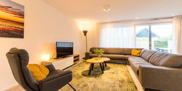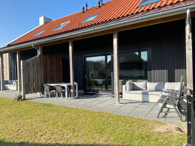 Via de woonkamer van dit 8-persoons vakantiehuis op Ameland heeft u toegang tot het terras, compleet met terrasmeubilair.