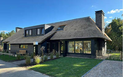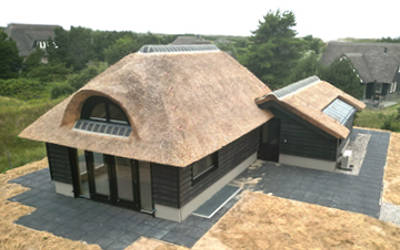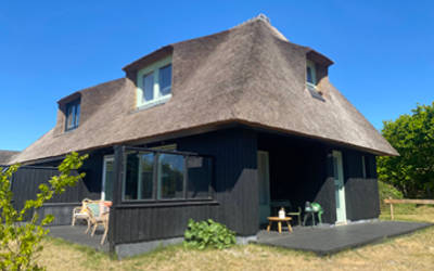 Dit riet gedekte, vrijstaande vakantiehuis ligt in een prachtig duingebied op loopafstand van het strand. Royale tuin met terras.